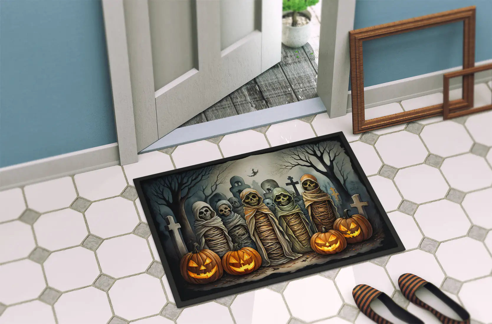 ★★★★★Celebrate Halloween with this Halloween Doormat. Welcome your guests in style with our Artwork Door Mat, designed to withstand almost any weather condition. This mat, measuring approximately 18 by 27 inches, is held together by durable black binding tape. Its top layer, composed of polyester felt, is dyed with the eye-catching image you see on the mat. A few layers below provide the mat with stability, while its rubber bottom is stamped to help prevent slipping and ensures safety. Our mat works wonderfully as both an indoor or outdoor door mat. For cleaning, simply hose it off with water or use a power washer - no need for any cleaner that produces suds. Avoid scrubbing with a brush, instead, opt for the vacuum on floor setting. Designed manufactured and printed in the USA, this mat is a perfect addition to your porch, outdoor kitchen, entryway, or any indoor space. Its unique design makes it a charming decorative rug that greets your guests and adds a stylish touch to your home decor.