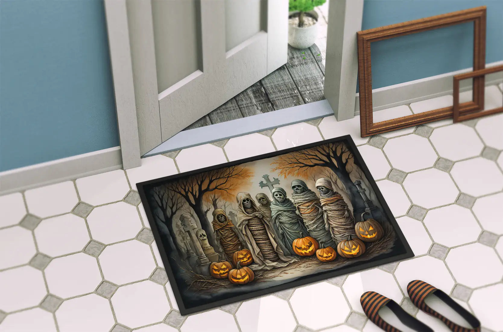 ★★★★★Celebrate Halloween with this Halloween Doormat. Welcome your guests in style with our Artwork Door Mat, designed to withstand almost any weather condition. This mat, measuring approximately 18 by 27 inches, is held together by durable black binding tape. Its top layer, composed of polyester felt, is dyed with the eye-catching image you see on the mat. A few layers below provide the mat with stability, while its rubber bottom is stamped to help prevent slipping and ensures safety. Our mat works wonderfully as both an indoor or outdoor door mat. For cleaning, simply hose it off with water or use a power washer - no need for any cleaner that produces suds. Avoid scrubbing with a brush, instead, opt for the vacuum on floor setting. Designed manufactured and printed in the USA, this mat is a perfect addition to your porch, outdoor kitchen, entryway, or any indoor space. Its unique design makes it a charming decorative rug that greets your guests and adds a stylish touch to your home decor.